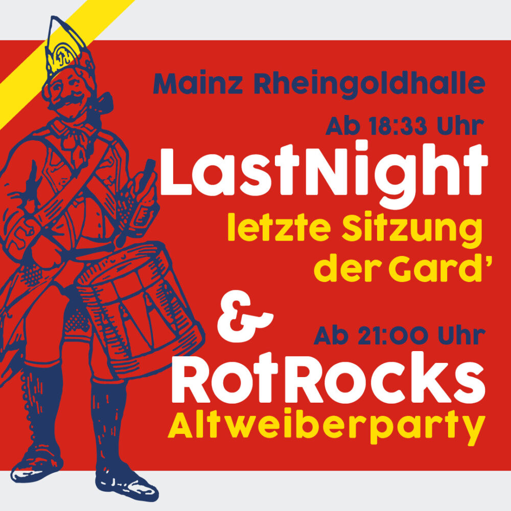 Wer nur zur RotRocks-Altweiber-Party kommen möchte, darf ab 20:11 Uhr die Rheingoldhalle zum Beben bringen! Karten dafür findet Ihr gesondert. Ab 18.33 Uhr kann zudem über eine Live-Übertragung das Sitzungsprogramm der LastNight angeschaut werden. HIER.